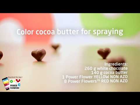 Coloured Cocoa Butter Australia }}- This recipe shows how Power Flowers™ are used to color cocoa butter, for spraying on moulded chocolates. You can create every color imaginable simply by ...